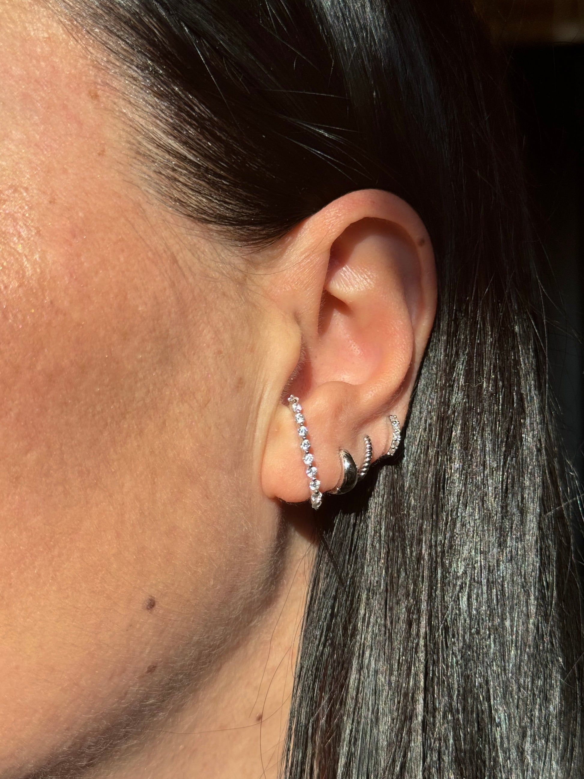 This minimalist earring set with zirconium stones, worn vertically on the lobe, adds the perfect touch of style for effortless elegance.