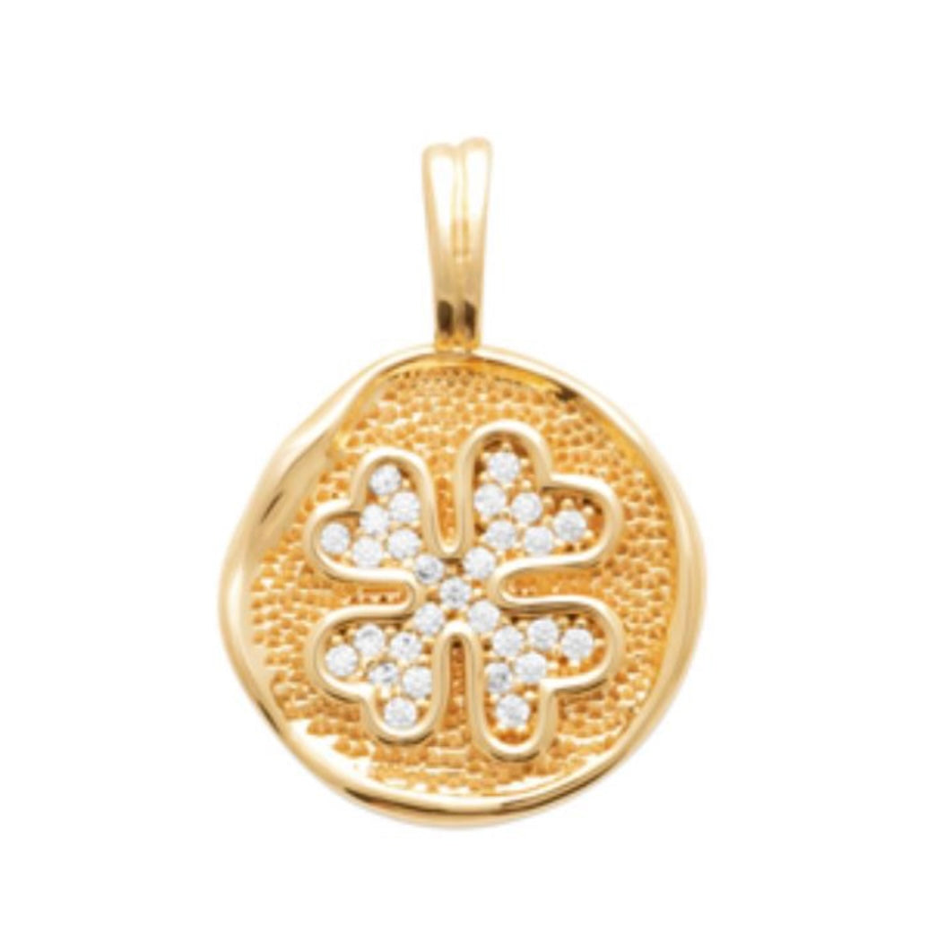 The Lucky Clover pendant features a textured round surface and a sparkling clover made of high-quality cubic zirconia.