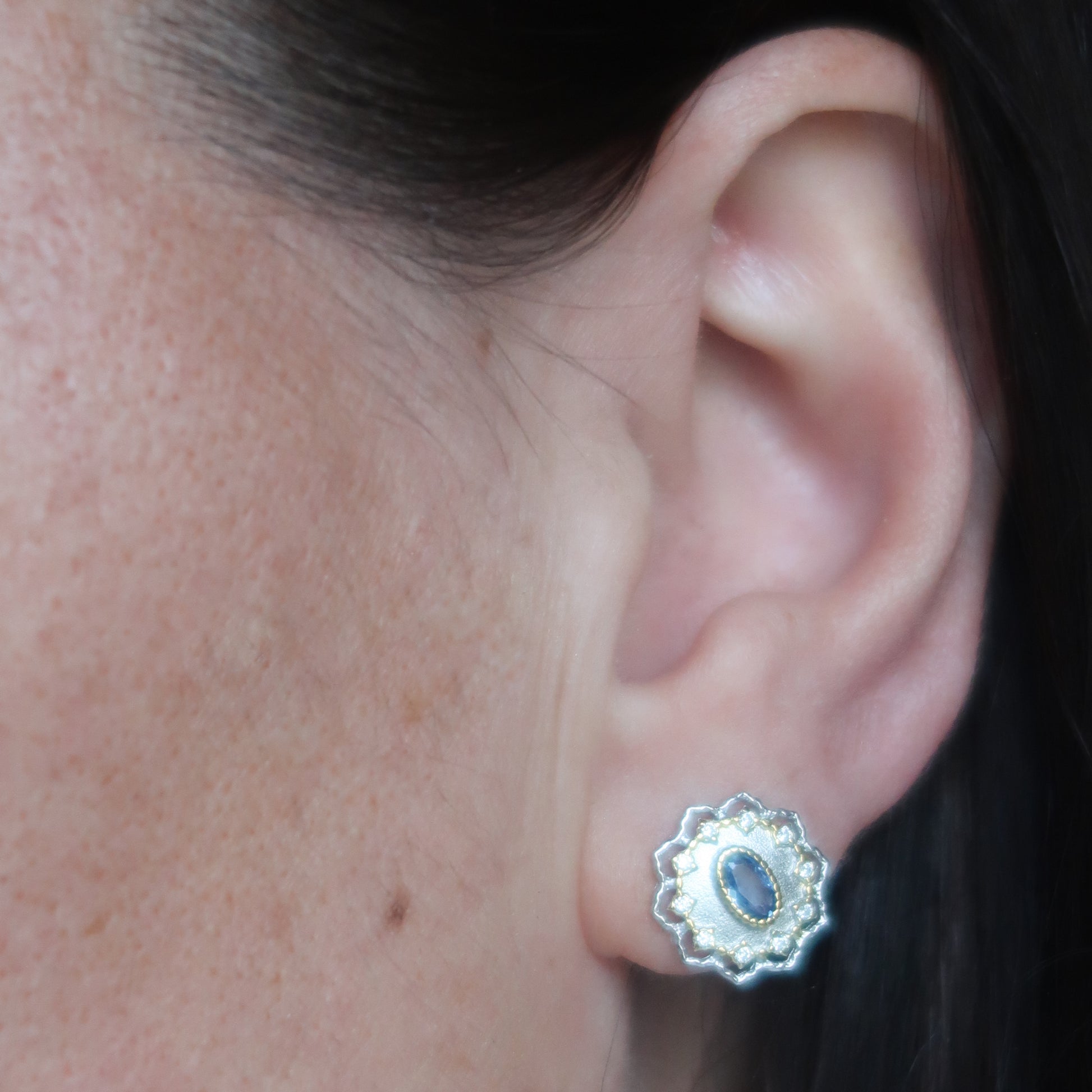 - Design: Montatura bicolore (argento e oro) con una pietra ovale blu al centro