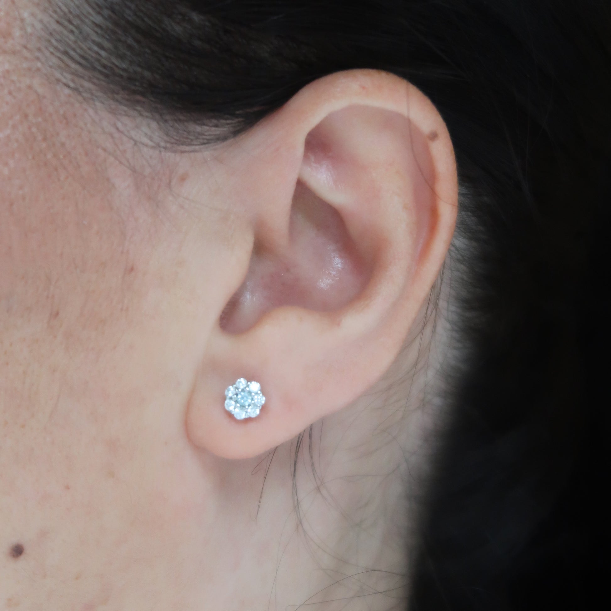 - Design: Fiore stilizzato con petali di zirconi bianchi e un’acquamarina centrale