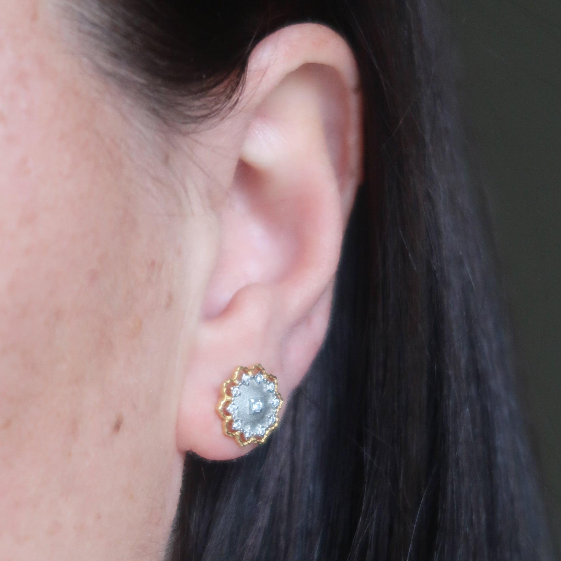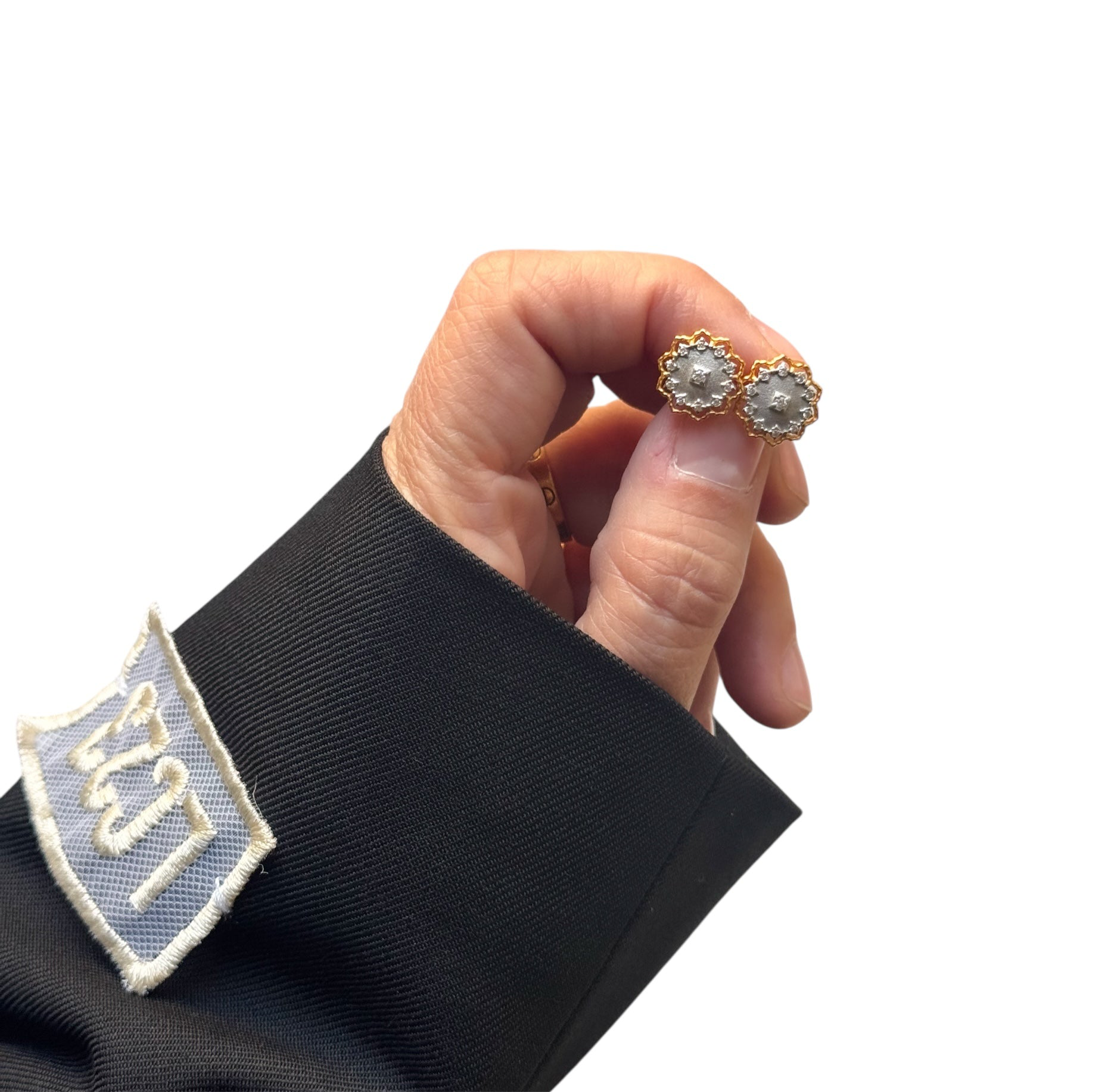 - Design: Montatura bicolore (argento e oro) con zirconi incastonati sia al bordo che al centro