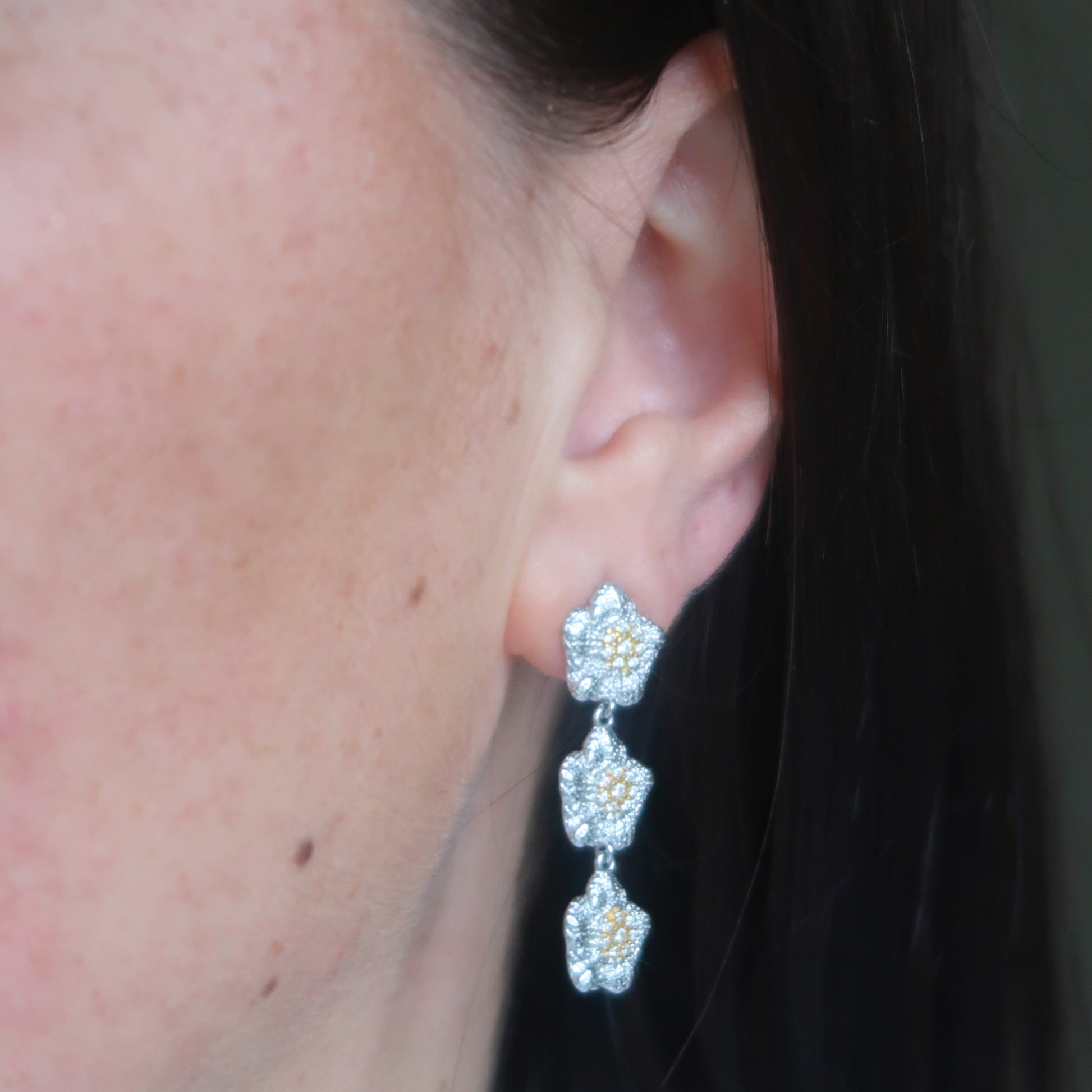 - Design: Tre fiori pendenti, uno sotto l’altro, con montatura in argento e bocciolo in oro tempestato di zirconi